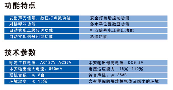 XJH127礦用隔爆兼本質安全型通訊聲光信號器結構為隔爆兼本安型設計。采用單片微控制器及調制解調技術,僅需一條四芯信號電纜,即能實現發出聲、光信號、單工對講、自動區分多水平、二級傳送、安*燈控制等功能。技術先進、設計合理、一機多用。可應用于皮帶機巷和絞車運輸巷作為聯絡信號使用。